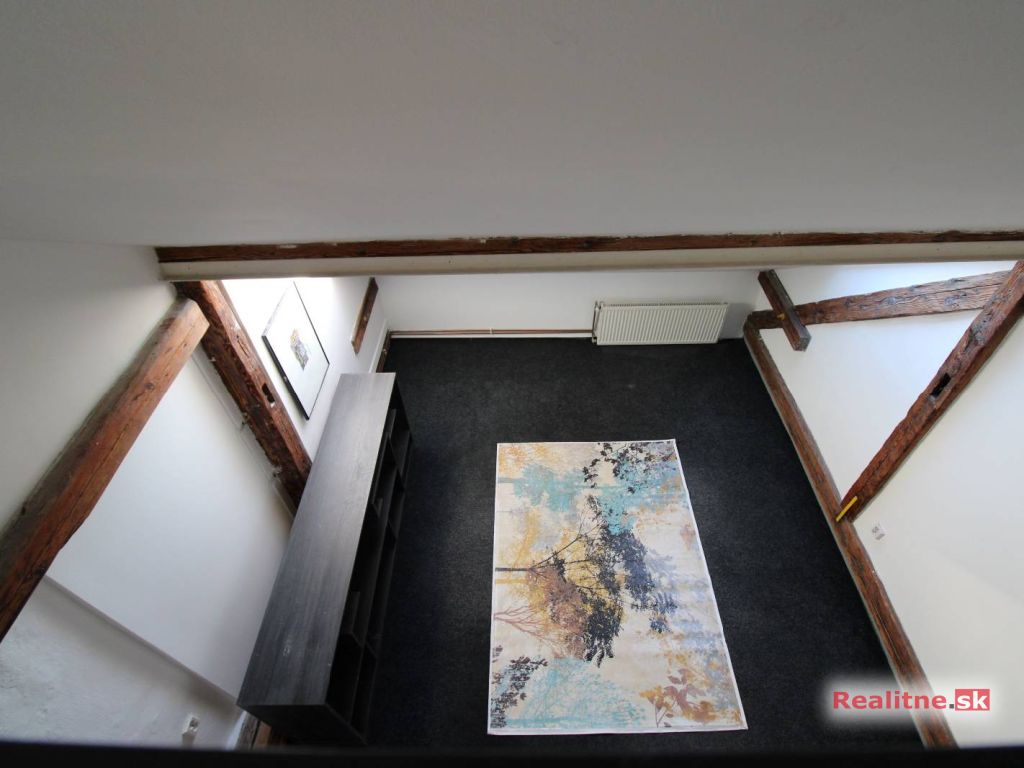 Atypickosť a útulnú atmosféru bytu/ateliéru dotvárajú priznané nosné drevené trámy v kombinácii s oceľovou galériou. Priestrannú obývaciu časť s vysokými stropmi dopĺňajú funkčné kachle, drobné schodíky s výstupom do otvorenej galérie s prechodom na oceľovú lávku.