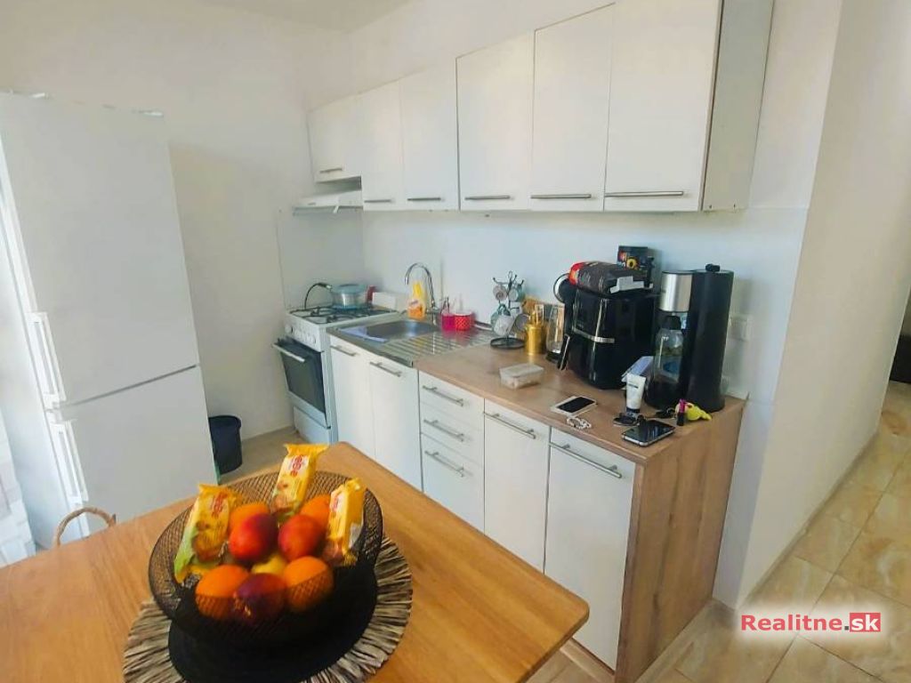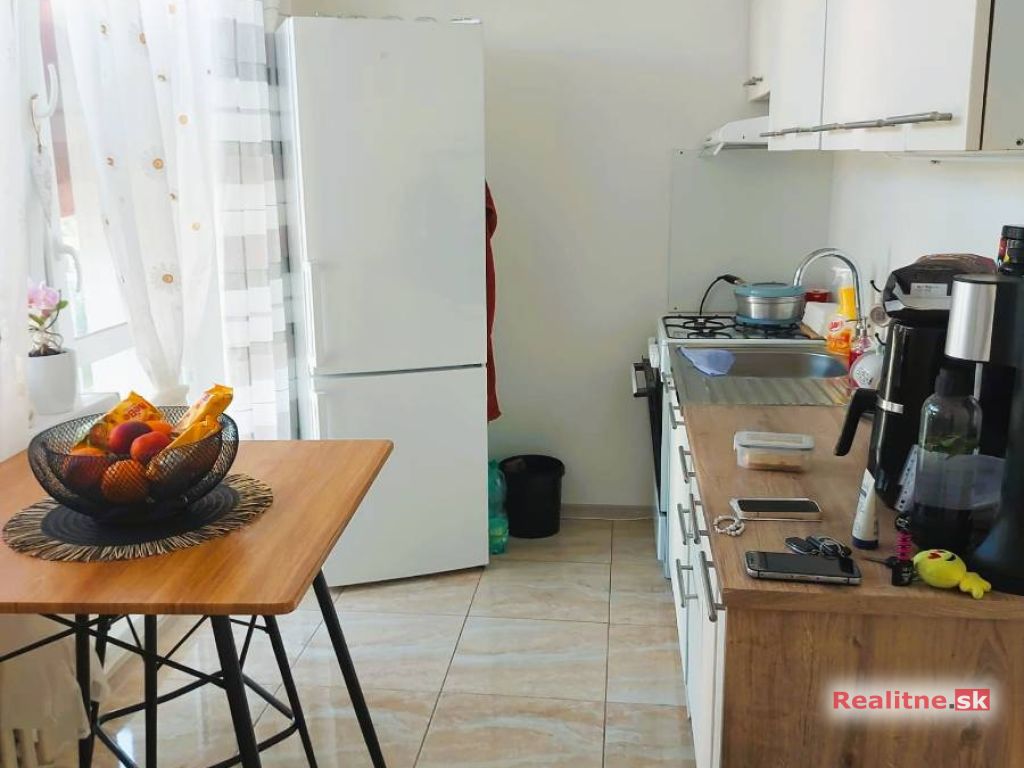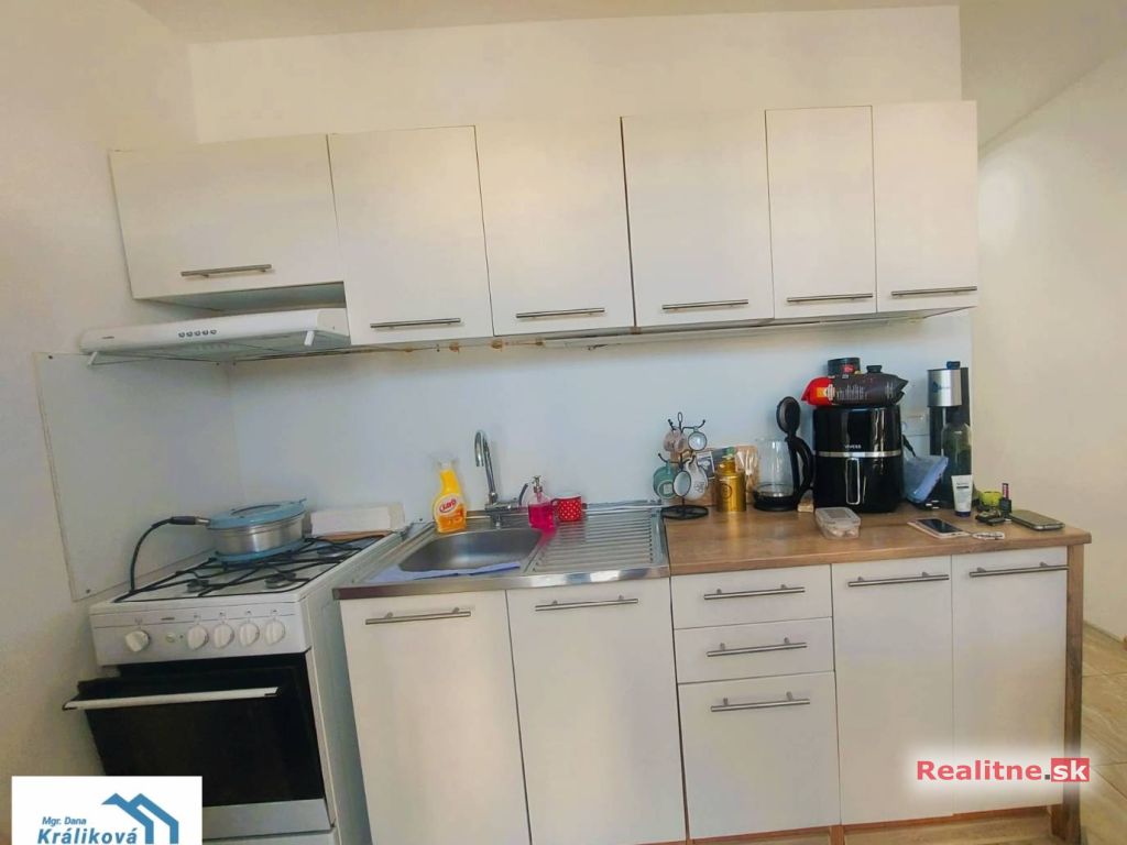 Kuchyňa – 3,45m x 2,2m s kuchynskou linkou obsahuje plynovú kombinovaný šporák, nerezový drez a digestor. Podlaha - keramická dlažba.