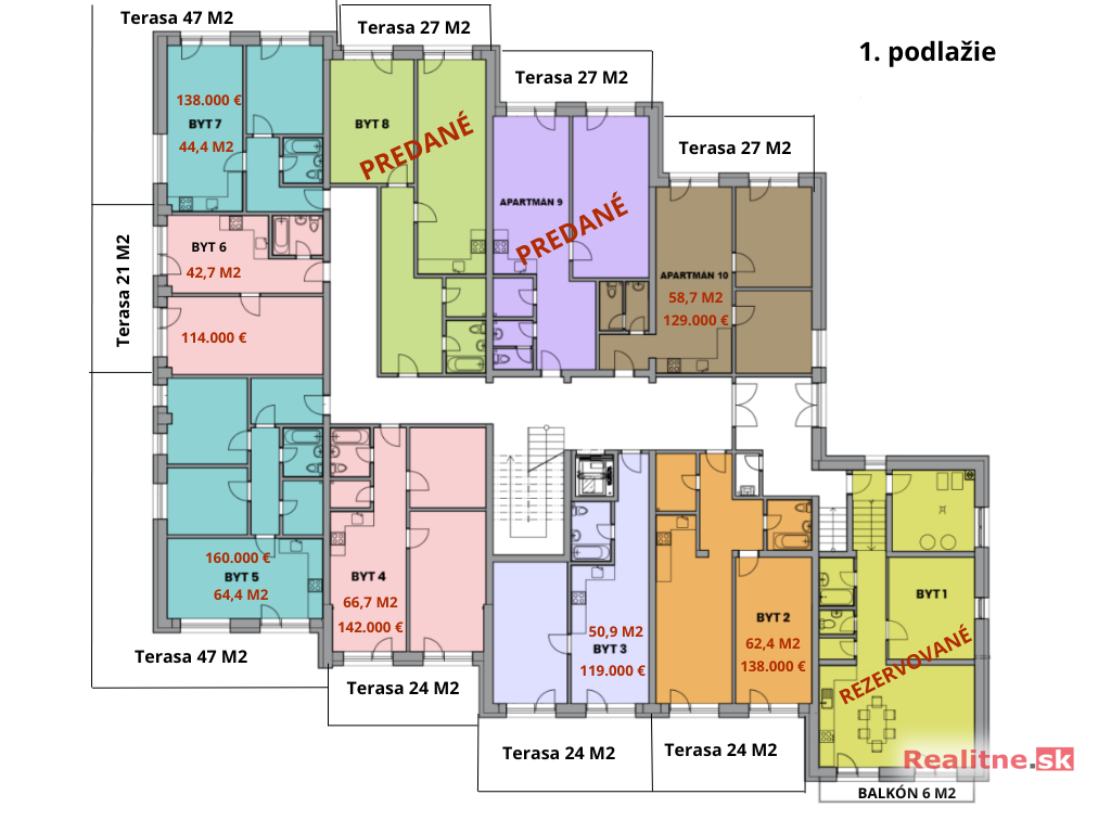 Byty sa predávajú v stave holobytu - v cene sú potery, omietky so základným bielym náterom, bez omietky v kúpeľniach, okná, elektroinštalácia - elektrorozvádzač so zapojenými ističmi a rozvodmi káblov do krabičiek (vrátane vypínačov a zásuviek), prívody vody a kanalizácie do kuchyne a kúpeľne ukončené zátkami. Všetky aktuálne voľné bytové jednotky vrátane rozlohy (bytu a terasy) a ceny pred zľavou nájdete vo fotografiách tohto inzerátu.