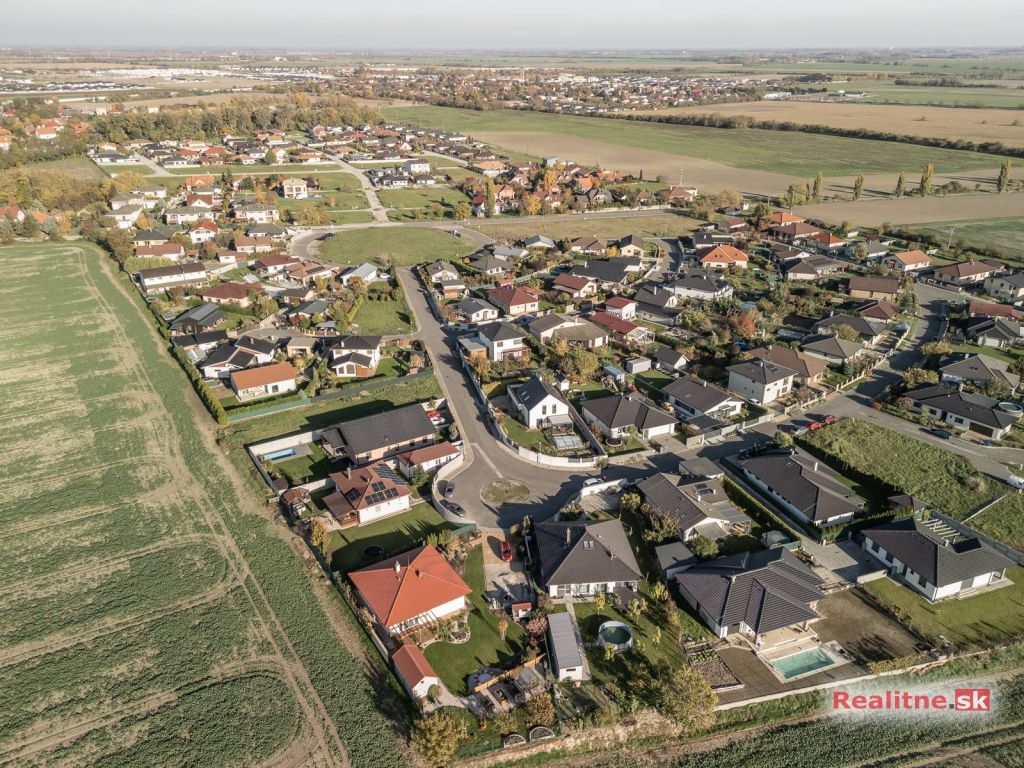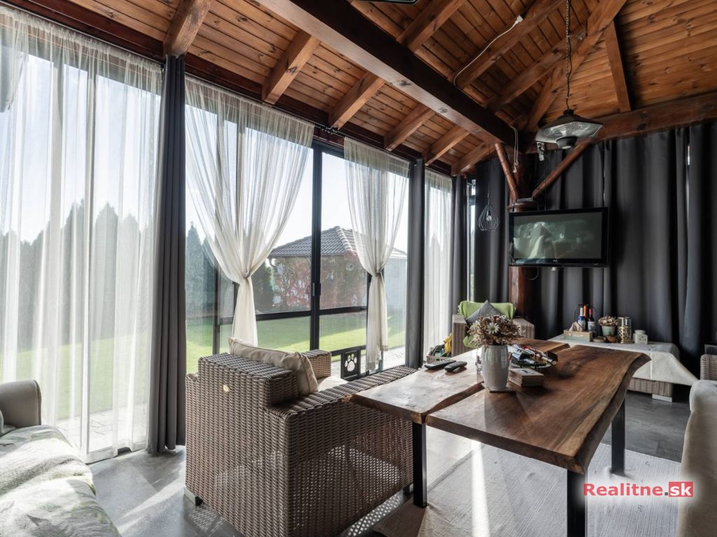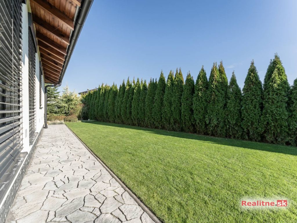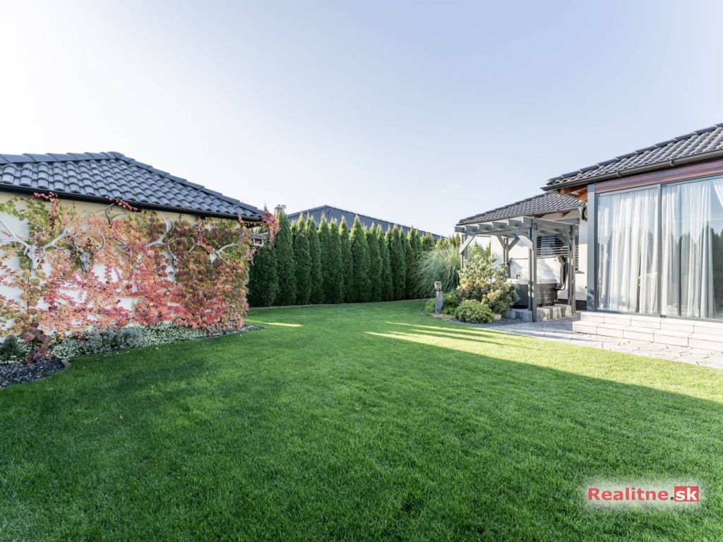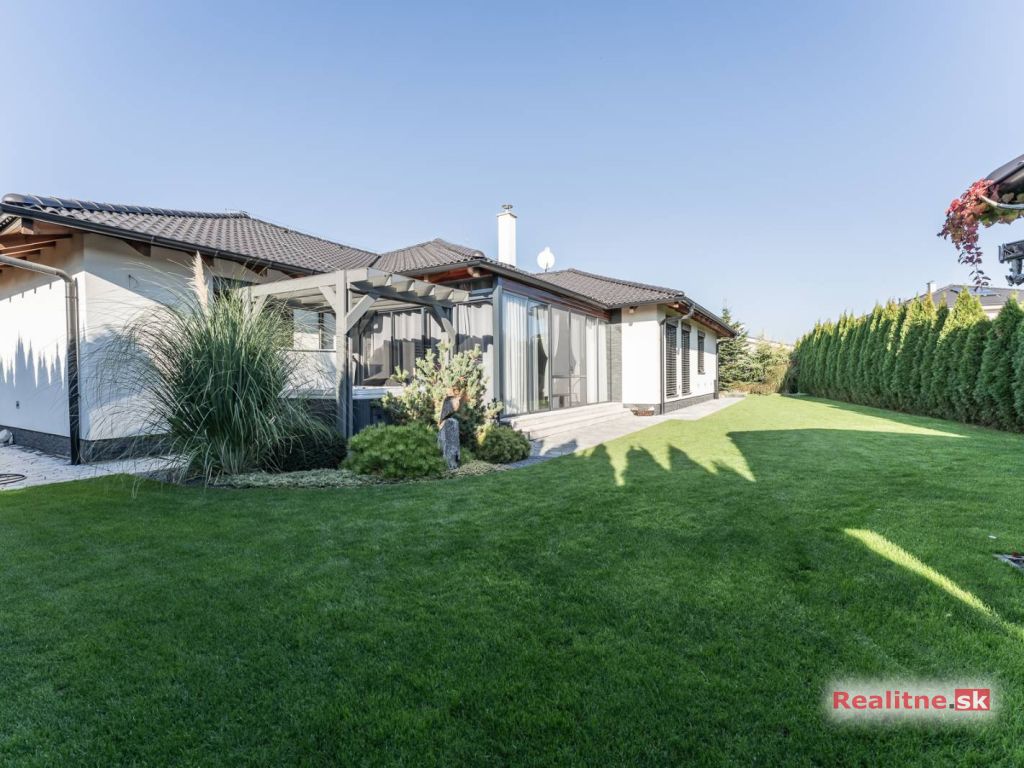RealityDS ponúka nádhernú luxusnú jednopodlažnú 5 izbovú novostavbu rodinného domu, typu bungalov, väčšej veľkostnej kategórie, so zimnou záhradou, altánkom s jakuzzou, dreveným záhradným domom na pozemku, s rozlohou 665 m2. Súčasťou domu je aj vykurovaná garáž (23,10 m2), so vstupom priamo z interiéru domu, s bránou na DO.