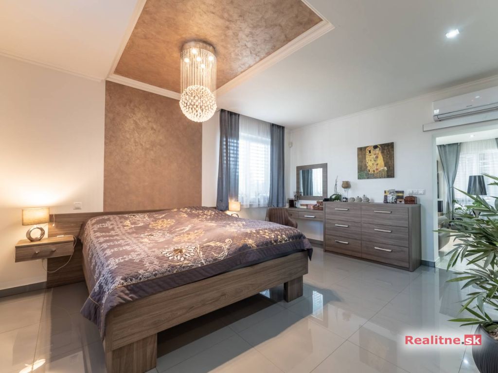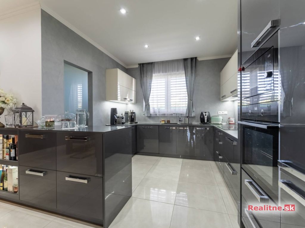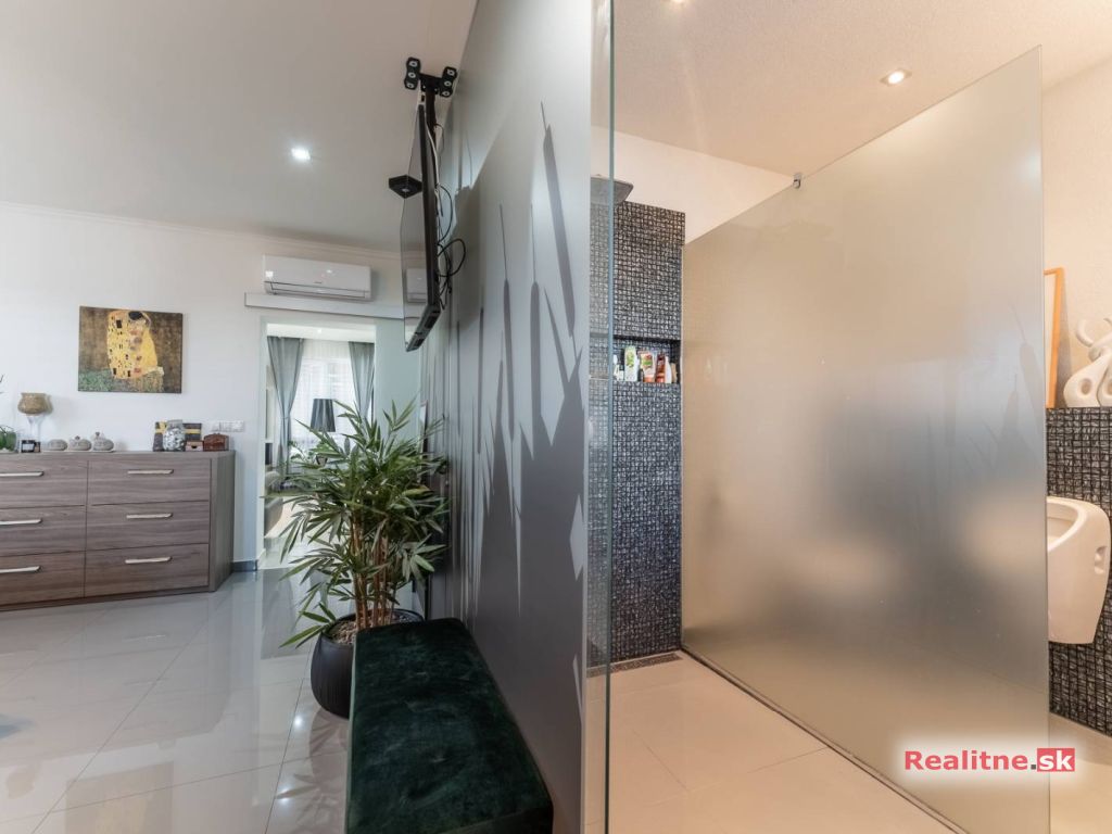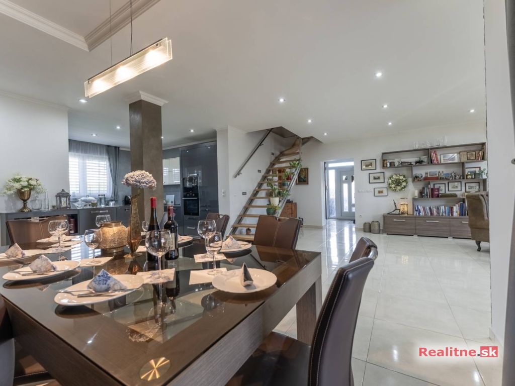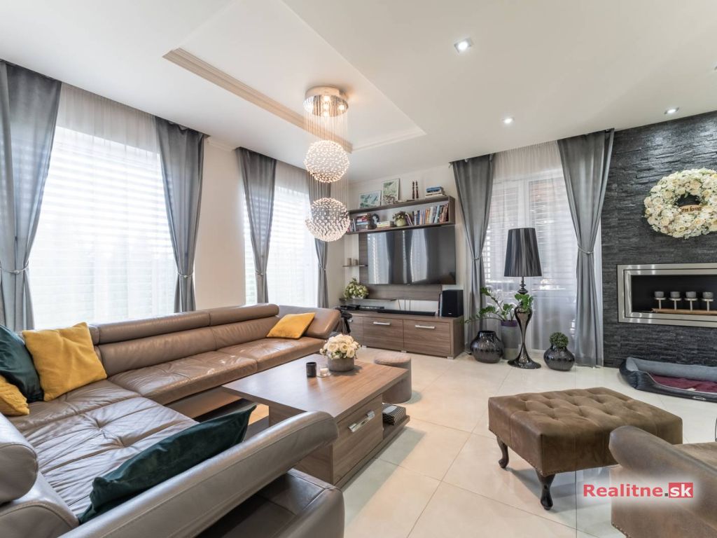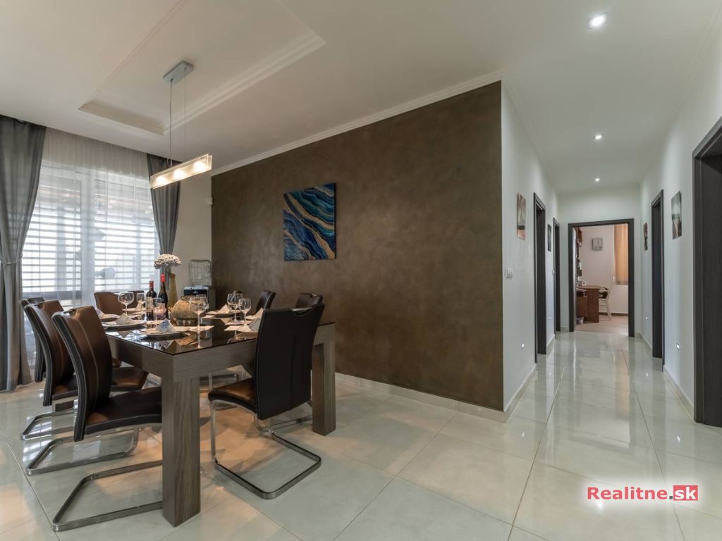RealityDS ponúka nádhernú luxusnú jednopodlažnú 5 izbovú novostavbu rodinného domu, typu bungalov, väčšej veľkostnej kategórie, so zimnou záhradou, altánkom s jakuzzou, dreveným záhradným domom na pozemku, s rozlohou 665 m2. Súčasťou domu je aj vykurovaná garáž (23,10 m2), so vstupom priamo z interiéru domu, s bránou na DO.