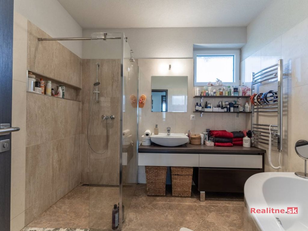 V dome je 3 x WC, 2 x kúpeľňa (hlavná kúpeľňa s vaňou, sprchou a umyvadlom a kúpeľňa dverami do vyhriatej garáže. V celom dome sú kvalitné interiérové dvere so zárubňami, kvalitná dlažba, nočné podsvietenie spojovacej chodby v dome, klimatizácia v obývacej izbe s kuchyňou a v spáľni + príprava pre klímu v troch izbách, alarm, s prípravou pre kamery, pôsobivé osvetlenie interiéru bodovým osvetlením, zabudovaným do sadrokartónových podhľadov. Moderná kuchynská linka na mieru so zabudovanými kvalitnými spotrebičmi ( indukčná elektrická varná doska, digestor, rúra, umývačka riadu).