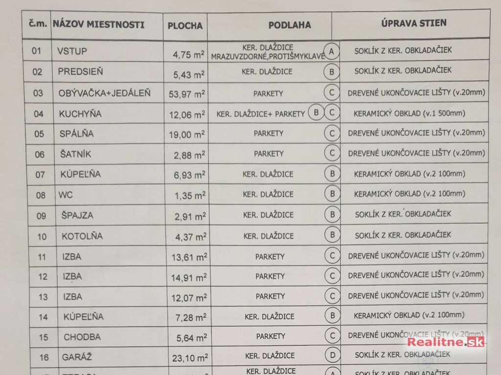 MATERIÁL: Dom prízemný, bez pivnice, betónové základy, hydroizolácia podláh. Obvodové múry a priečky z tvárnic Ytong, zateplenie obvodových múrov 15 cm polystyrénom, fasáda - čiastočne obložený prírodný kameň. Strecha – hranoly, betónová škridlová krytina, zn. MEDITERAN, izolácia strechy minerálnou vlnou, zn. ISOVER, 40 cm. Rozloha podkrovia je 200 m2 - v časti podkrovia vybudovaná jedna izba (kancelária), ostatná časť oddelená priečkou, vydoskovaná, pochôdzna, vhodná ako úložný priestor. Kvalitné päťkomorové plastové okná s izolačným trojsklom, zn. PLASTECH, sieťky, vonkajšie elektrické rolety na DO na všetkých oknách, plastové bezpečnostné vchodové dvere, nočné podsvietenie domu.