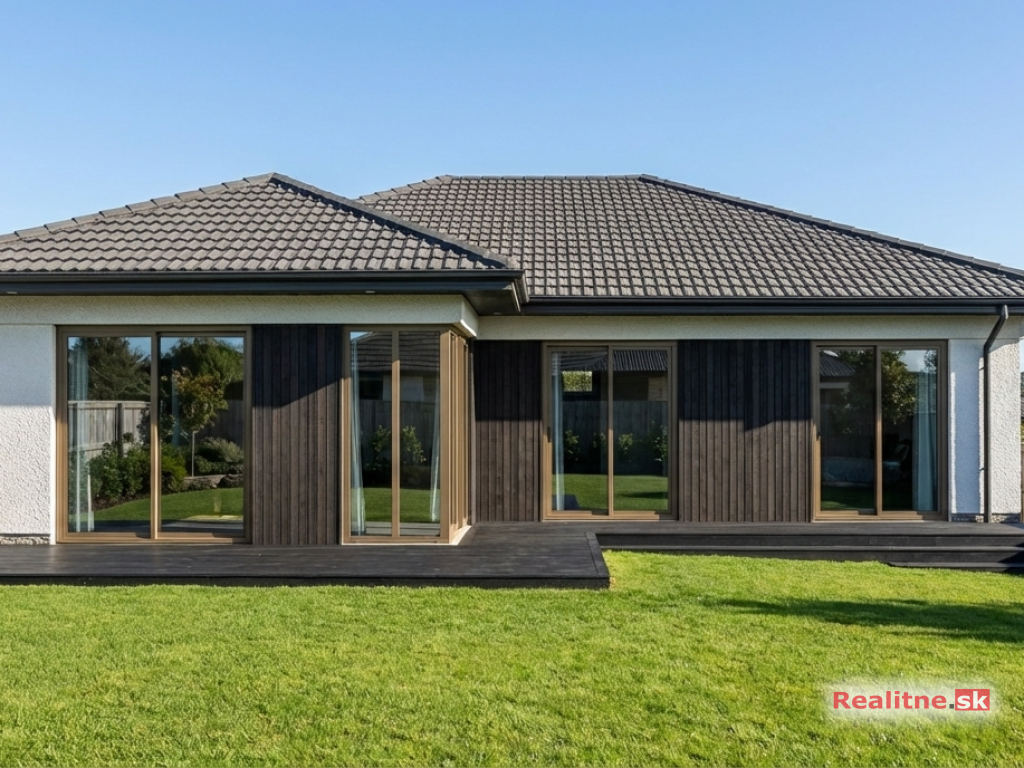 Typ domu: Prízemný rodinný bungalov s integrovanou garážou.
